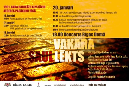 Programma “Vakara saullēkts” iecerēta kā godinājums mūsu kopīgajai pagātnei un atgādinājums par sakņu sajūtas un kopīgās atmiņas nepieciešamību. 1991. gada janvāra notikumi ievilka dziļus vaibstus Rīgas sejā un kļuva par neizrokamiem robežstabiem mūsu neatkarības ceļā. 20. janvāra vakarā Rīgas Domā cilvēka balss savīsies ar kokles skaņu sidrabaino burvību un stīgu kvarteta klasisko tvirtumu, lai ieceltu mūs mūzikas šūpulī vakara saullēkta zeltainajā atblāzmā uz Vecrīgas bruģa un debesīs virs Daugavas.