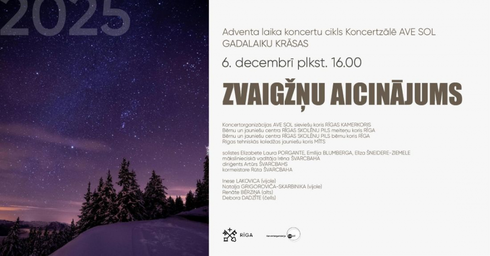 6. decembra pēcpusdienā Koncertzālē AVE SOL koncertā “Zvaigžņu aicinājums” muzicēs sieviešu koris “Rīgas kamerkoris”, meiteņu koris “Rīga”, bērnu koris “Rīga” un jauniešu koris “Mīts”.